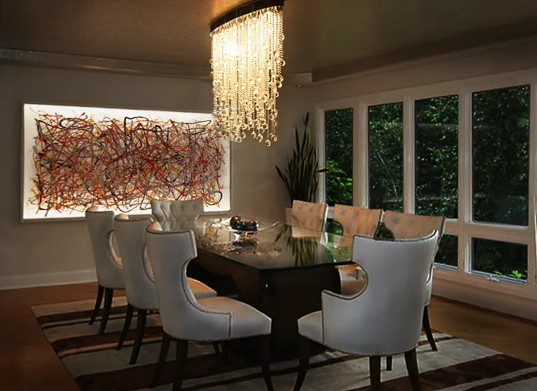 This magnificent custom colored 4ft x 8ft Illuminated Washi on the wall featured in a modern dining area is done by Precious Pieces. This is specially designed to give the feeling of a modern abstract painting; based on 02 – KUMO / Quilted Cloud. It comes in various colorswhich will light up the dinner table.