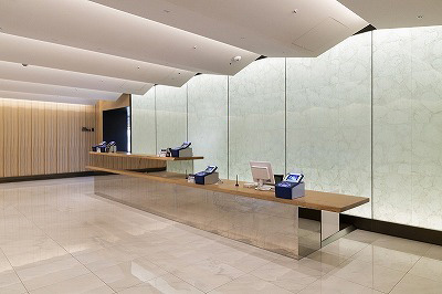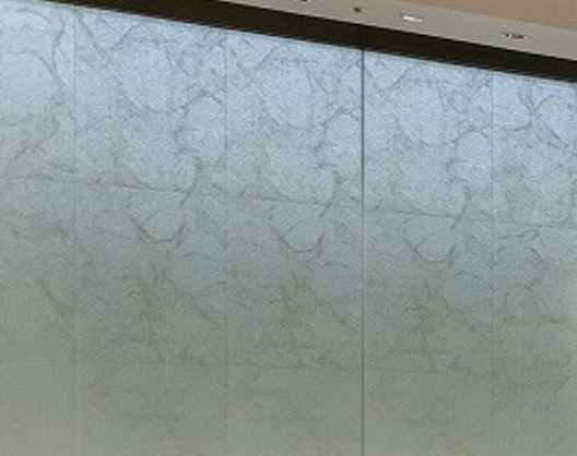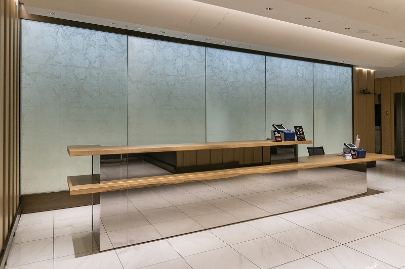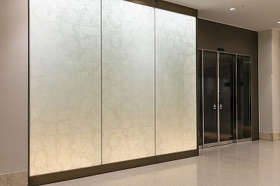 A laminated Washi glass wall with a marvelous, illuminated appearance was installed as the back wall of an office reception area. It created an organic atmosphere that complemented the contemporary interior.