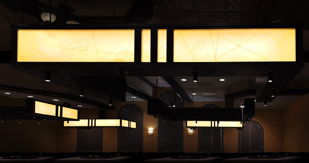 Hiro Odaira/Precious Pieces designed and fabricated custom hand crafted Hibachi overhead lighting with our premium Washi and Door/Screens for a restaurant in Chicago. The Hibachi overhead lighting made by Japanese superior wood craft with acrylic surface protection diffuser. The door/glass screen is specially made for main dining room as well as for the restrooms by the employed Japanese traditional Sukashi watermark techniques.